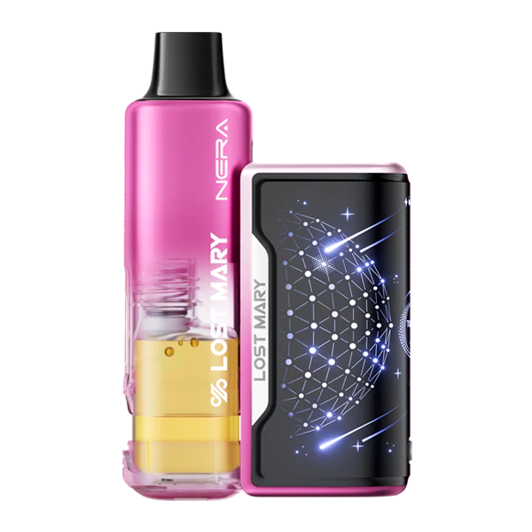The Lost Mary Nera Fullview Dragon Strawnana delivers disposable-style satisfaction in a smart, modular kit. Each set includes the smart battery, two 10 ml refill pods and two disposable pods. The pods snap together effortlessly and then connect to the screen-equipped battery charging dock. To fill the top pod portion, lay the device on its side or flip it upside down to let the liquid flow in. It performs just like a disposable vape—only with the convenience of pre-filled, swappable pods.